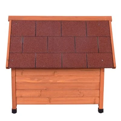 Caseta para perros fabricada con madera impermeabilizada de pino de explotación sostenible. Con techo a dos aguas de cartón asfaltado reforzado con saliente protector. Patas regulables.